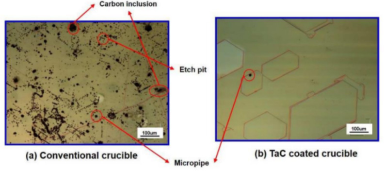 Thông thường có ba chiến lược chính để kiểm soát các khiếm khuyết trong các tinh thể đơn SIC. Bên cạnh việc tối ưu hóa các thông số tăng trưởng và sử dụng các vật liệu nguồn chất lượng cao (như bột nguồn SIC), việc chuyển sang cacatit phủ cacbua tantalum cũng có thể thúc đẩy chất lượng tinh thể tốt hơn.