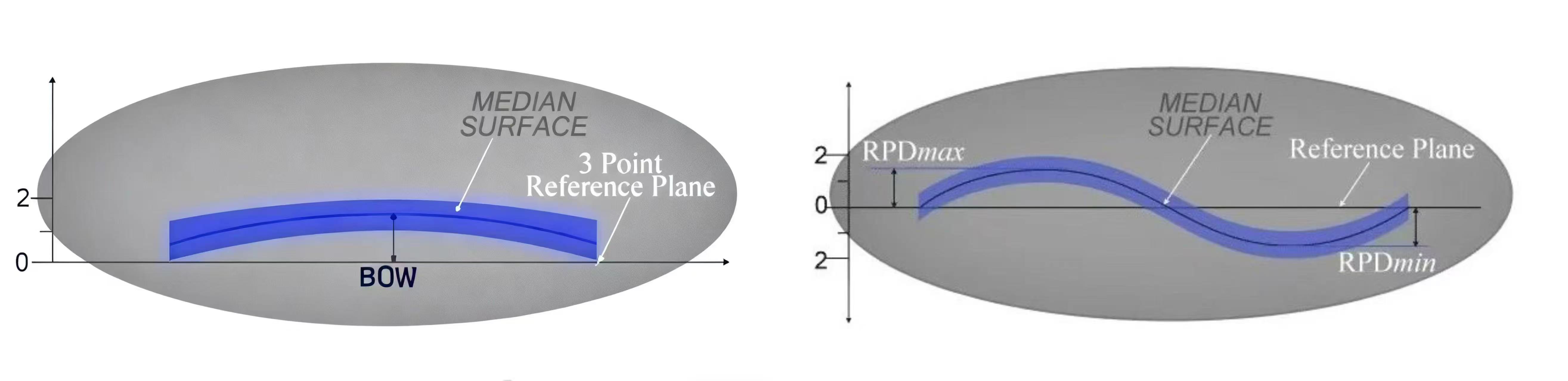 Chỉ báo cung tập trung vào độ lệch dọc của khu vực trung tâm tấm bán dẫn, chỉ phản ánh trạng thái uốn cục bộ. Nó phù hợp để đánh giá các kịch bản nhạy cảm với độ phẳng cục bộ. Chỉ báo độ cong rất hữu ích để đánh giá độ phẳng và độ biến dạng tổng thể vì nó xem xét độ lệch của toàn bộ bề mặt tấm bán dẫn và cung cấp thông tin về độ phẳng tổng thể cho toàn bộ tấm bán dẫn.