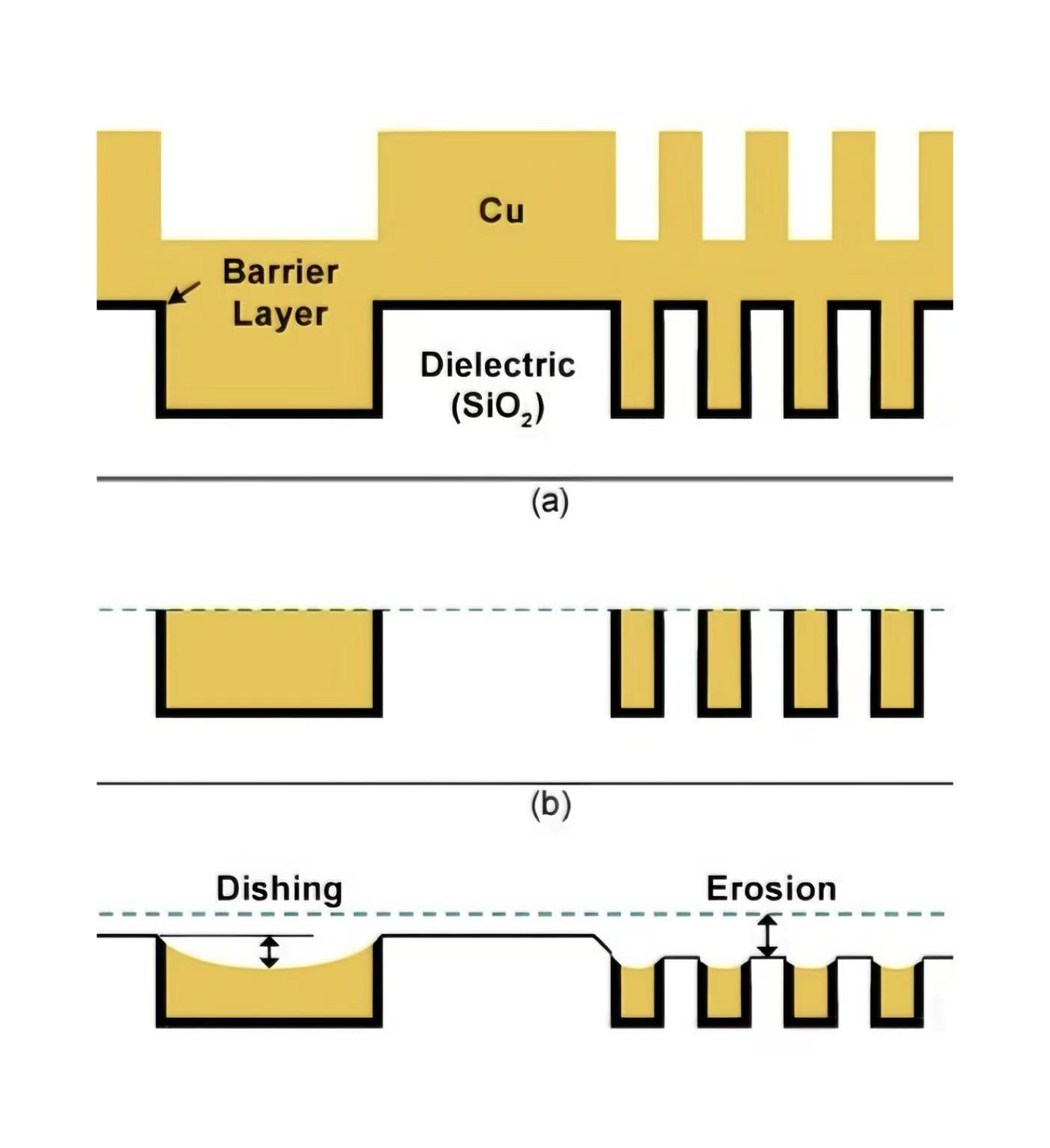 Đánh bóng có nghĩa là đánh bóng quá mức các vật liệu mềm hơn (như đồng) trong quá trình CMP, dẫn đến các vết lõm ở trung tâm hình đĩa cục bộ. Thường gặp ở những đường kim loại rộng hoặc những khu vực kim loại lớn, hiện tượng này xuất phát chủ yếu từ sự không đồng nhất về độ cứng của vật liệu và sự phân bổ áp suất cơ học không đồng đều. Dishing có đặc điểm chủ yếu là một vết lõm ở trung tâm của một đường kim loại rộng, duy nhất, với độ sâu của vết lõm thường tăng theo chiều rộng của đường.