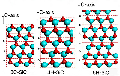 Tất nhiên, vật liệu SiC không bao gồm một khối tứ diện gồm một nguyên tử Si và một nguyên tử C mà là vô số nguyên tử Si và C. Một số lượng lớn nguyên tử Si và C tạo thành các lớp nguyên tử kép nhấp nhô (một lớp nguyên tử C và một lớp nguyên tử Si), và nhiều lớp nguyên tử kép xếp chồng lên nhau tạo thành tinh thể SiC. Do những thay đổi định kỳ xảy ra trong quá trình xếp chồng các lớp nguyên tử kép Si-C, hiện có hơn 200 cấu trúc tinh thể khác nhau với sự sắp xếp riêng biệt. Hiện nay, các dạng tinh thể phổ biến nhất trong ứng dụng thực tế là 3C-SiC, 4H-SiC và 6H-SiC.